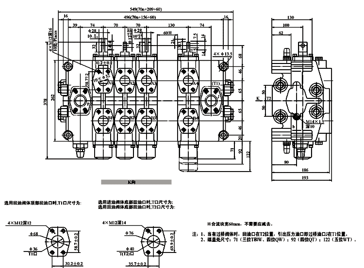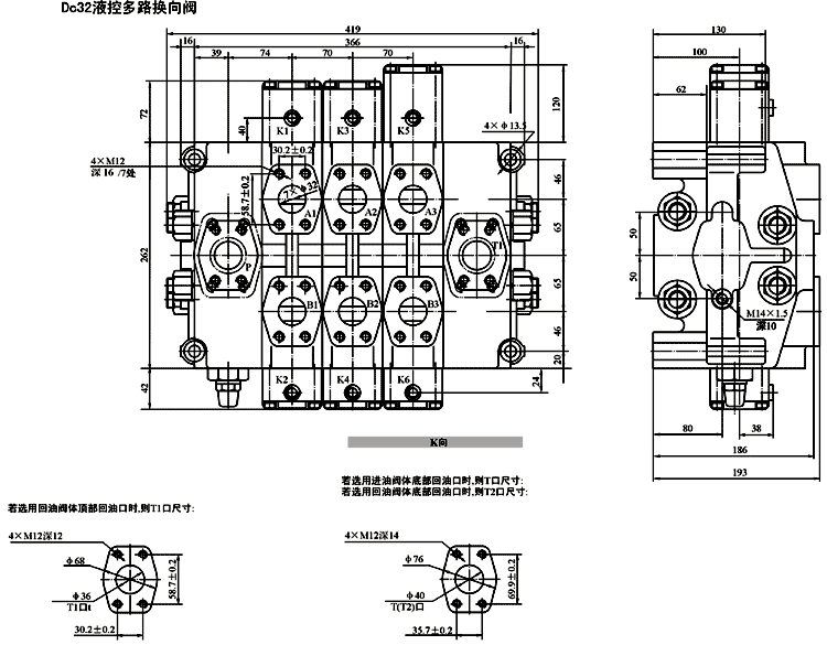 DC32型多路換向閥的外形及安裝連接尺寸: