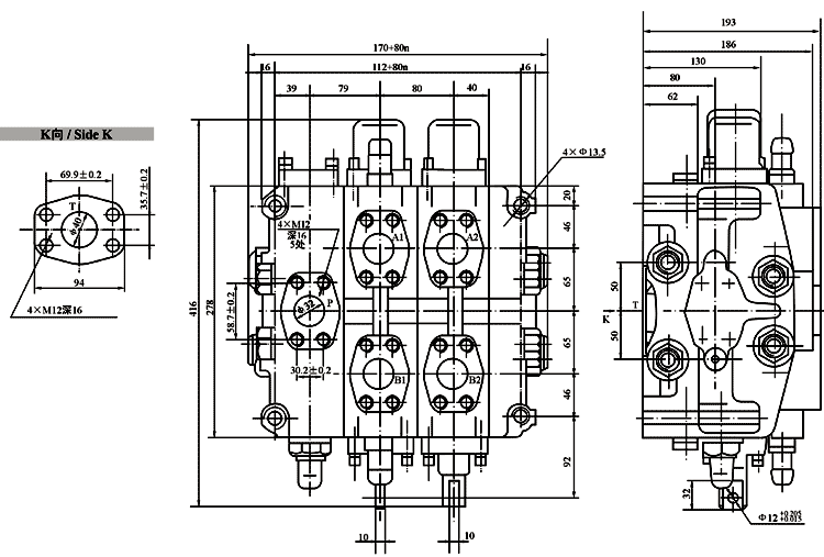 DC32型負載反饋多路換向閥的外形及安裝連接尺寸:
