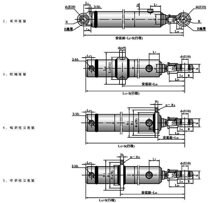 2.活塞桿端為外螺紋桿頭耳環(huán)連接: