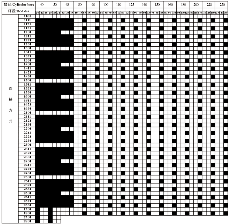 用戶(hù)選型完后,請將選用的主參數(缸徑、活塞桿徑)及連接方式編號與下表進(jìn)行核對,以免選型差錯。
